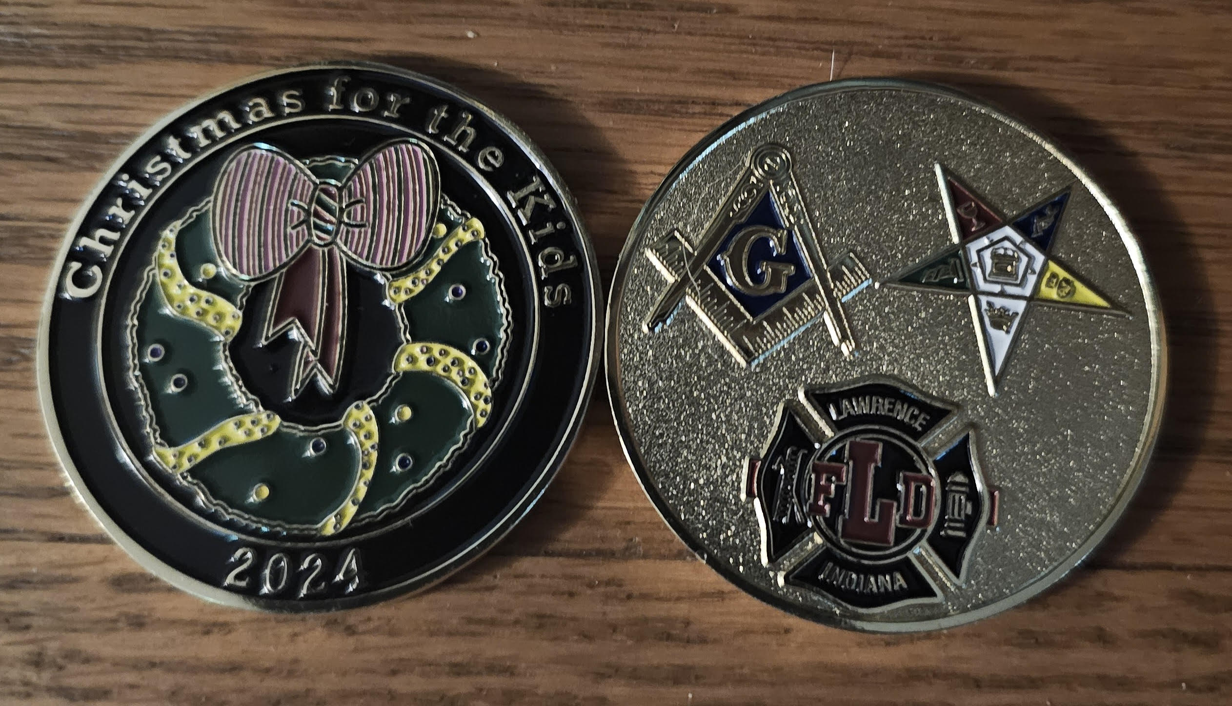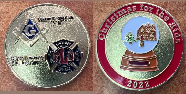 Oakland Masonic Lodge #140 and the City of Lawrence Fire Department have partnered for a third year to offer this challenge coin in support of the 2023 Christmas for the Kids campaign. It is never too early to start fundraising for a worthy cause! All profits from this project will go directly to the City of Lawrence Fire Department Christmas event. These coins are 1.75 inches in diameter and are polished gold tone. The obverse has both the Masonic square and compass, Order of Eastern Star “Star” and the City of Lawrence Fire Department maltese cross. The reverse is a Wreath, with the fundraiser name “Christmas for the Kids” around the top, and the year “2024” centered at the bottom. These challenge coins would make an excellent stocking stuffer or gift – all the while supporting those less fortunate. We are selling these coins for $20 each – this includes delivery in the continental US.