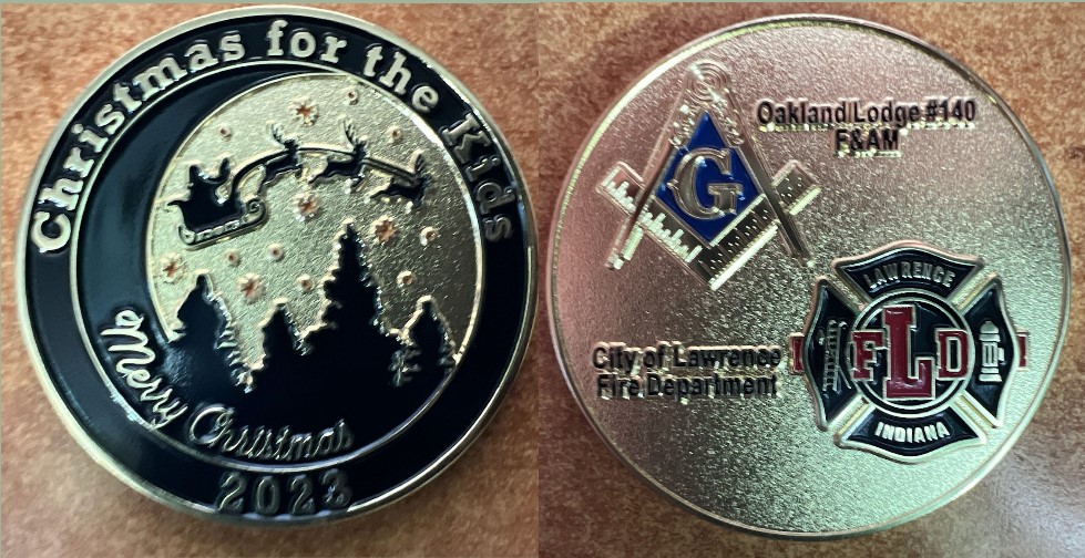 Oakland Masonic Lodge #140 and the City of Lawrence Fire Department have partnered for a third year to offer this challenge coin in support of the 2023 Christmas for the Kids campaign. It is never too early to start fundraising for a worthy cause! All profits from this project will go directly to the City of Lawrence Fire Department Christmas event. These coins are 1.75 inches in diameter and are polished gold tone. The obverse has both the Masonic square and compass and the City of Lawrence Fire Department maltese cross. The reverse is Santa Flying through the Snow , with the fundraiser name “Christmas for the Kids” around the top, and the year “2023” centered at the bottom. These challenge coins would make an excellent stocking stuffer or gift – all the while supporting those less fortunate. We are selling these coins for $20 each – this includes delivery in the continental US.
