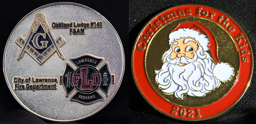 Oakland Masonic Lodge #140 and the City of Lawrence Fire Department have partnered to offer this challenge coin in support of the 2021 Christmas for the Kids campaign. This is the first-year issue for this annual coin to help make Christmas possible for those less fortunate. It is never too early to start fundraising for a worthy cause! All profits from this project will go directly to the City of Lawrence Fire Department Christmas event. These coins are 1.75 inches in diameter and are polished gold tone. The obverse has both the Masonic square and compass and the City of Lawrence Fire Department maltese cross. The reverse is the jolly ole elf himself – Santa, with the fundraiser name “Christmas for the Kids” around the top, and the year “2021” centered at the bottom. These challenge coins would make an excellent stocking stuffer or gift – all the while supporting those less fortunate. We are selling these coins for $15 each – this includes delivery in the continental US.